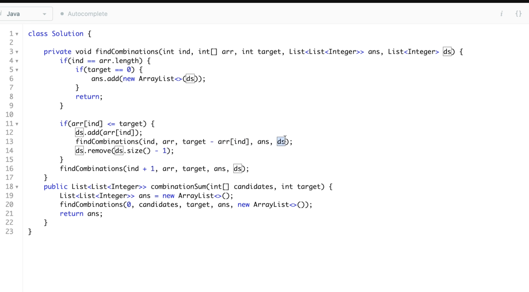 Q: Given an array of distinct integers candidates and a target integer target, return a list of all unique combinations of candidates where the chosen numbers sum to target. You may return the combinations in any order.
