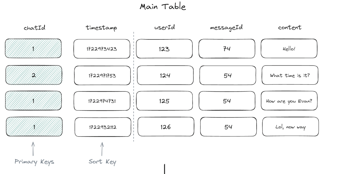 Partition Key: A single attribute that, along with the sort key (if present), uniquely identifies each item in the table. SortKey: The sort key is used to order items with the same partition key value, enabling efficient range queries and sorting within a partition. Example: Group chat application, it would make sense to use the chat_id as the partition key and message_id as the sort key.