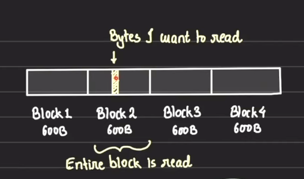 one disk read = one block read of sample size 600B 1 GB hard disk is split into 600B size blocks 1 read will load complete block which contains that data.