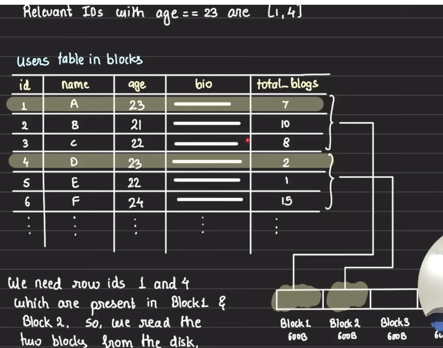 Iterate index (worst case complete index block by block) Check if entry has age>23 If yes add id in buffer If no discard For all id from the buffer read all id from disk add it to buffer return buffer