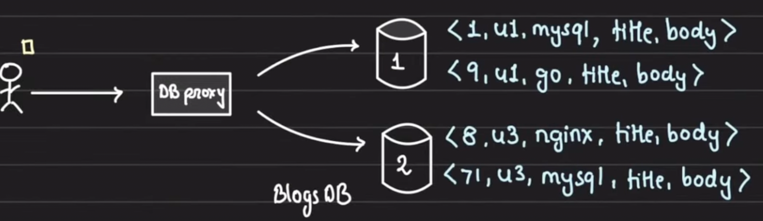 if we have to fetch all books with category mysql select * from blogs where category = “mysql” it will need to fanout query on all the shards and scan complete DB. if any of the shard is slow, it will wait for all the shards to respond.