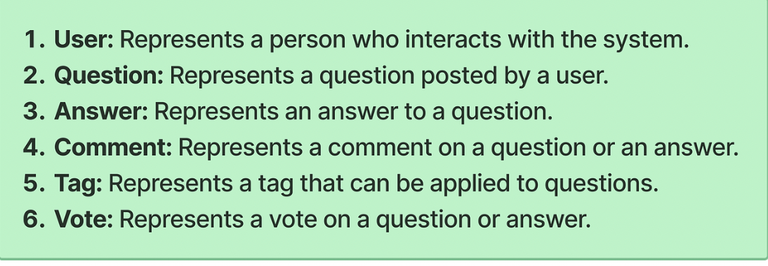 For Stack Overflow, different entities we can have are: