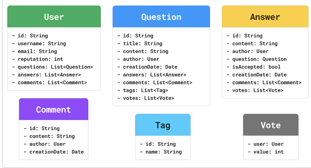 In our Stack Overflow example, here are some of the relationships between classes: