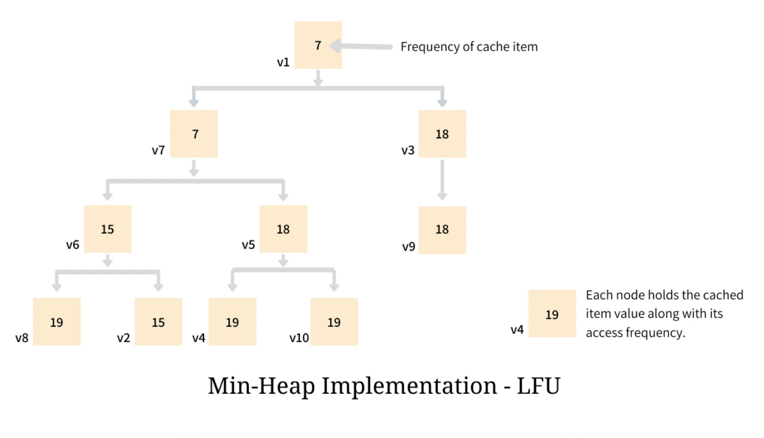 Although the identification of the element to be evicted is quick, but in order for the heap to maintain its property - element with lowest access frequency be at the top - it demands a rebalance, and this rebalancing process has a running complexity of O(log n). To make things worse, rebalancing is required every single time the frequency of an item is changed; which means that in the cache that implements LFU, every time an item is either inserted, accessed or evicted, a rebalance is required - making all the three core operations to have the time complexity of O(log n).